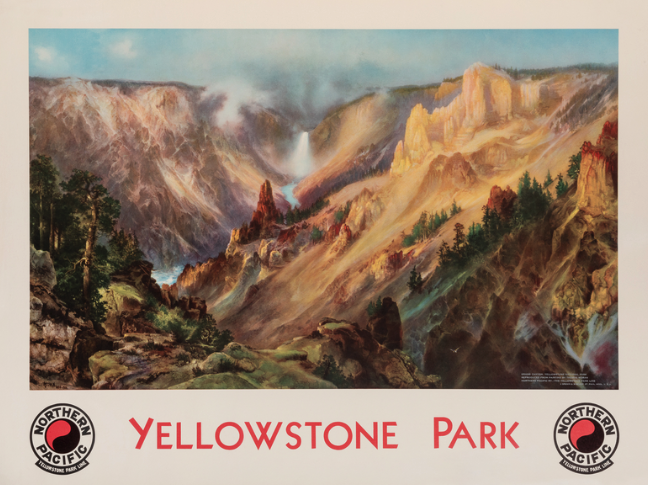 Northern Pacific railroad travel poster featuring a Thomas Moran illustration of Yellowstone, offered at Potter & Potter this week.